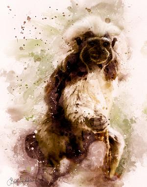 Escape into Artist Beau Gustafson's mystical 'Whispers of the Forest.' A serene Cotton Top Tamarin gazes from amidst lush foliage, evoking ancient, vibrant worlds. Enhanced photography blends seamlessly with delicate watercolor, conjuring misty rainforest mornings. Soft, muted colors dance across majestic, tiny features. Ideal for nurseries or wildlife sanctuaries, this enchanting piece inspires awe, tranquility and devotion to nature's hidden treasures."