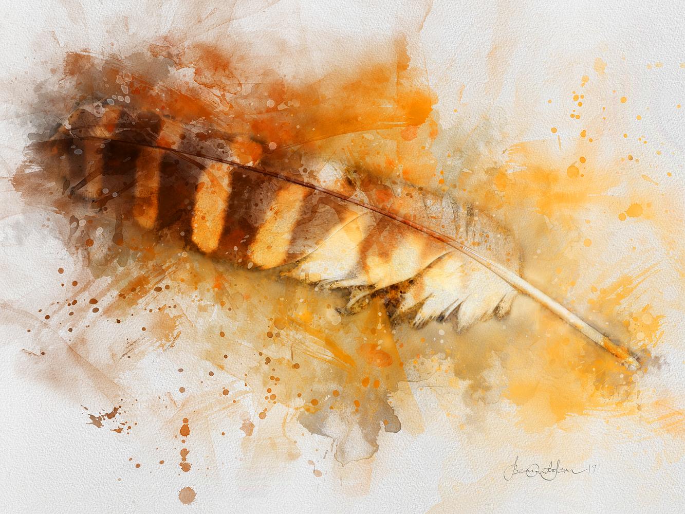 This captivating, digitally enhanced photograph of a hawk feather, crafted with a unique digital watercolor technique, radiates warmth. Soft yellows, vibrant oranges and earthy browns blend in delicate harmony, evoking serenity and wonder.