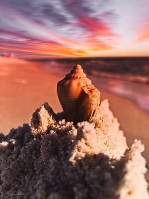 Immerse yourself in the mesmerizing elegance of Artist Beau Gustafson's "Giant in Miniature " This exquisite photograph captures a fleeting moment of pure wonder, transforming the ordinary into the extraordinary. As the sun dips below the horizon, bathing the world in vibrant hues of gold, amber, and crimson, a small shell on the beach is elevated from simplicity to splendor. Taken from a daringly low angle, the photograph magnifies the shell to monumental proportions, showcasing nature's intricate craftsmanship against the backdrop of a mirrored ocean, ablaze with the sunset's glorious palette.