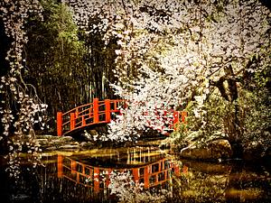 Delicate cherry blossoms unfurl like rose-tinted silk, dancing above tranquil waters. A majestic red bridge, weathered to perfection, invites contemplation. Soft sunlight filters through lush canopies, casting gentle shadows that beckon reflection.