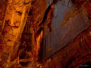 Title: "Ancient Whispers" Description "Uncover secrets with Artist Beau Gustafson's captivating 'Ancient Whispers.' A sandstone canyon wall, in Zion National Park, kissed by warm desert light, conceals a mysterious face. Inspired by Native American legends, this photograph embodies refinement, adventure, and timeless enchantment.