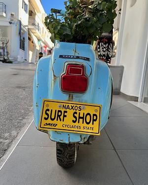 Naxos Greece, Surf Shop. On the island of Naxos, Greece, a colorful Vespa in a colorful town.